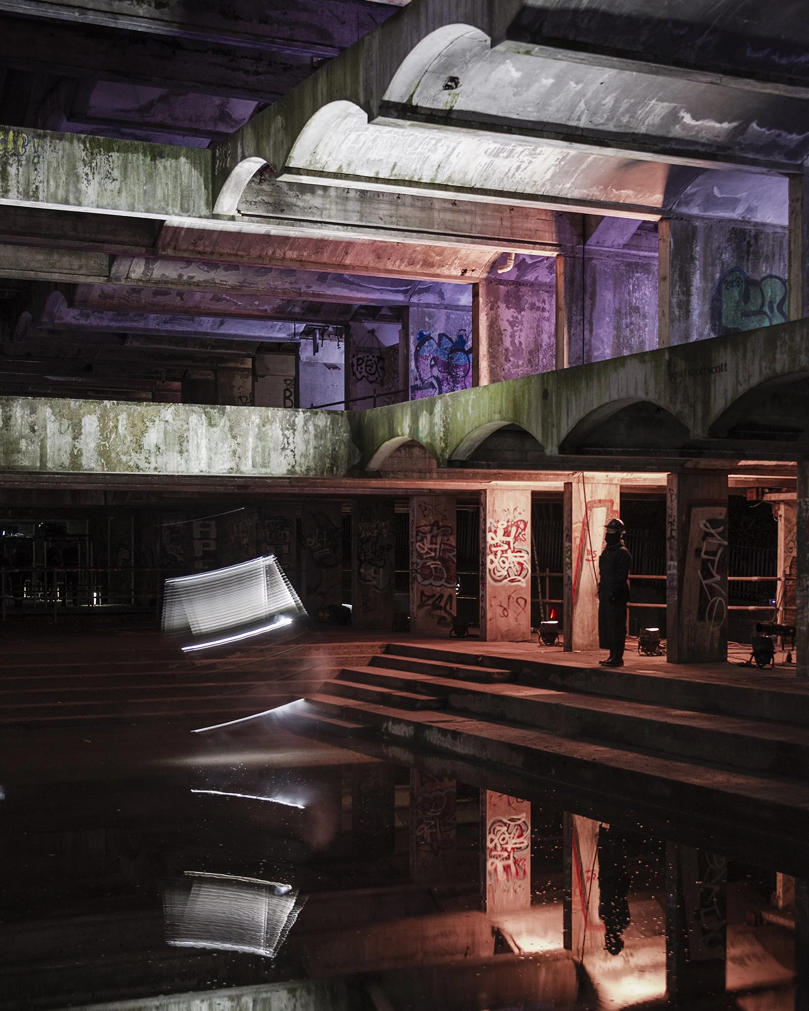 The concrete shell of this masterpiece of modernist concrete architecture has been stabilised and was illuminated for the occasion with a combination of moving light and projections. The effect was haunting and spectacular.